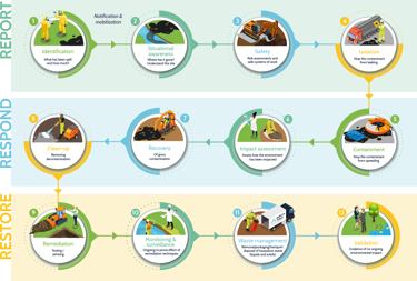 - Identification – what has been spilt and how much (notification and mobilisation)